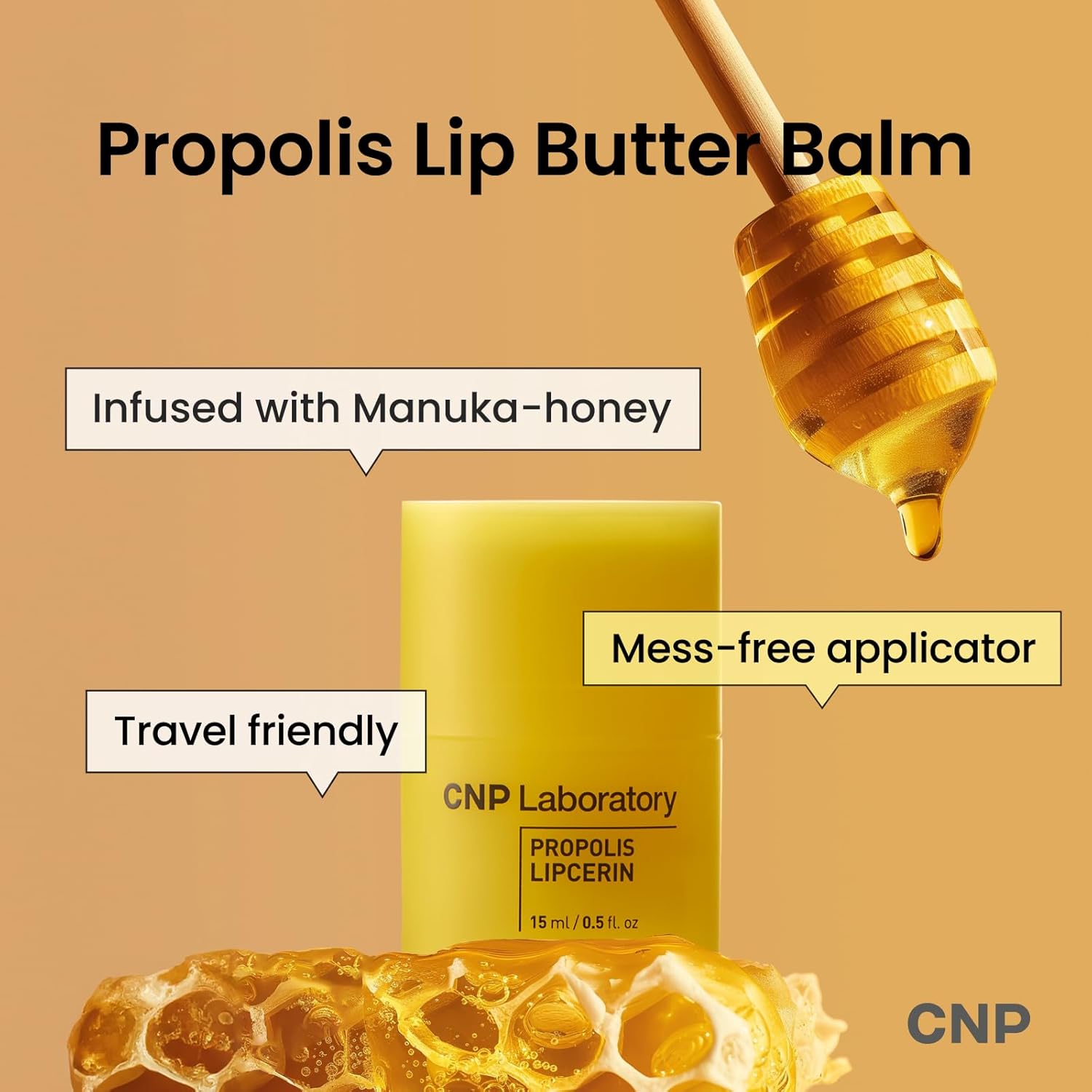 CNP Honey Lip Butter (0.5 fl.oz / 15ml) – Propolis Lipcerin™, Hydrating Overnight Manuka Lip Balm & Mask, 12hrs Long-lasting Moisture, Gentle Exfoliation, Hygienic Twist Dispenser, Korean Skin Care